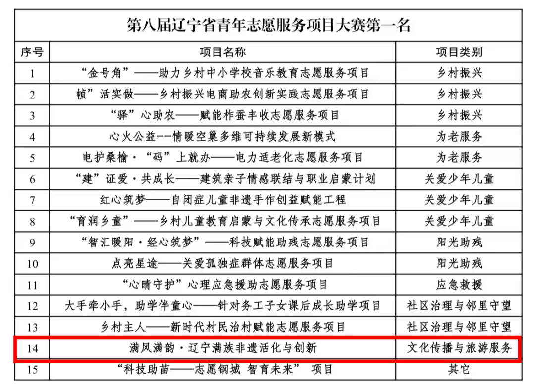 近日,由共青团辽宁省委员会、中共辽宁省社会工作部、中共辽宁省委党史研究室等14家单位联合主办的辽宁省青年志愿服务项目大赛暨志愿服务交流会顺利落下帷幕。我校艺术设计学院“满风满韵·辽宁满族非遗活化与创新”志愿服务项目凭借鲜明的专业特色与扎实的实践成效,在全省99个(包含高校专项赛59个,社会专项赛40个)决赛入围项目的路演答辩与专家评审中脱颖而出斩获第一名。